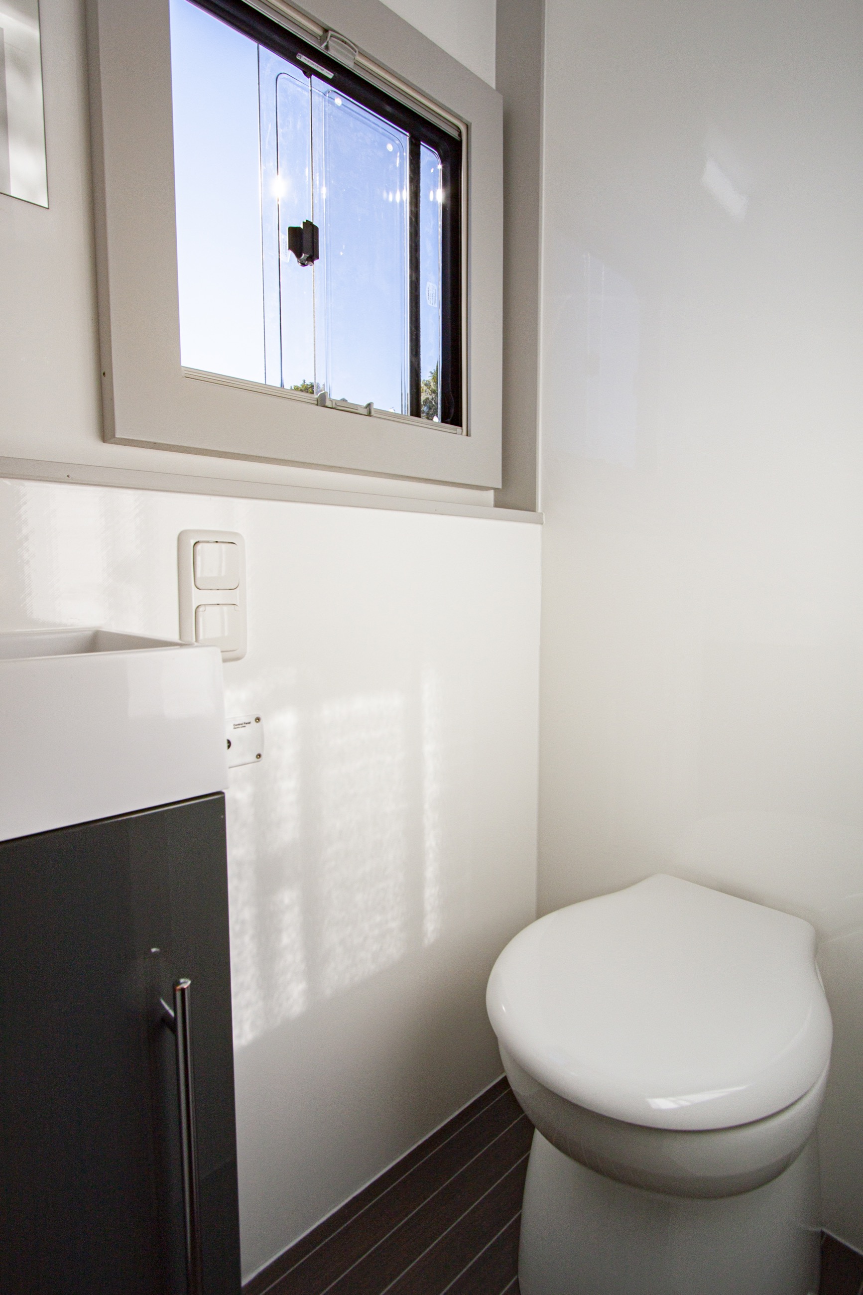 Badezimmer mit Dusche, Toilette und Waschtisch