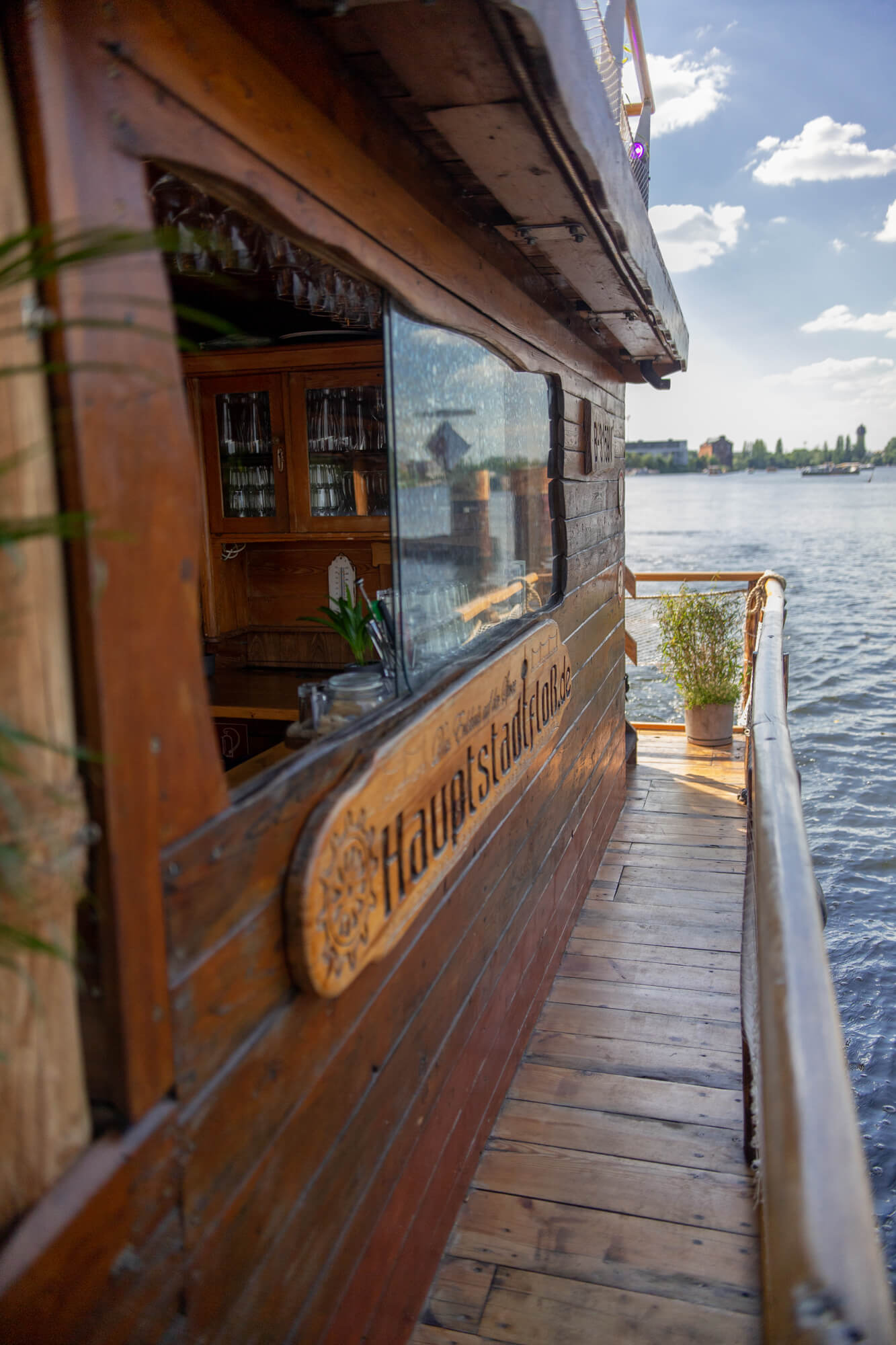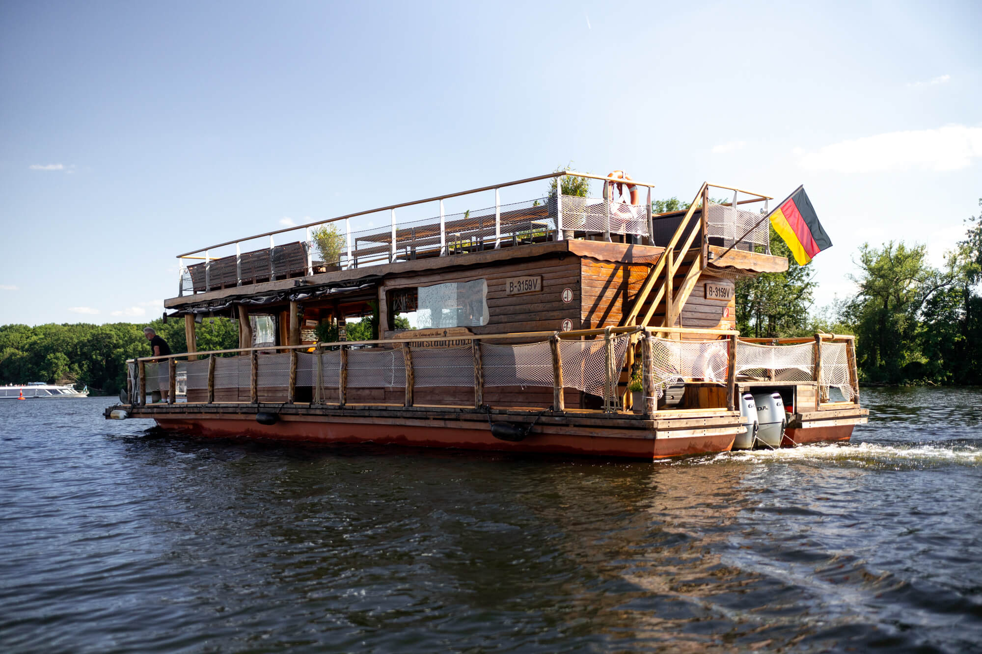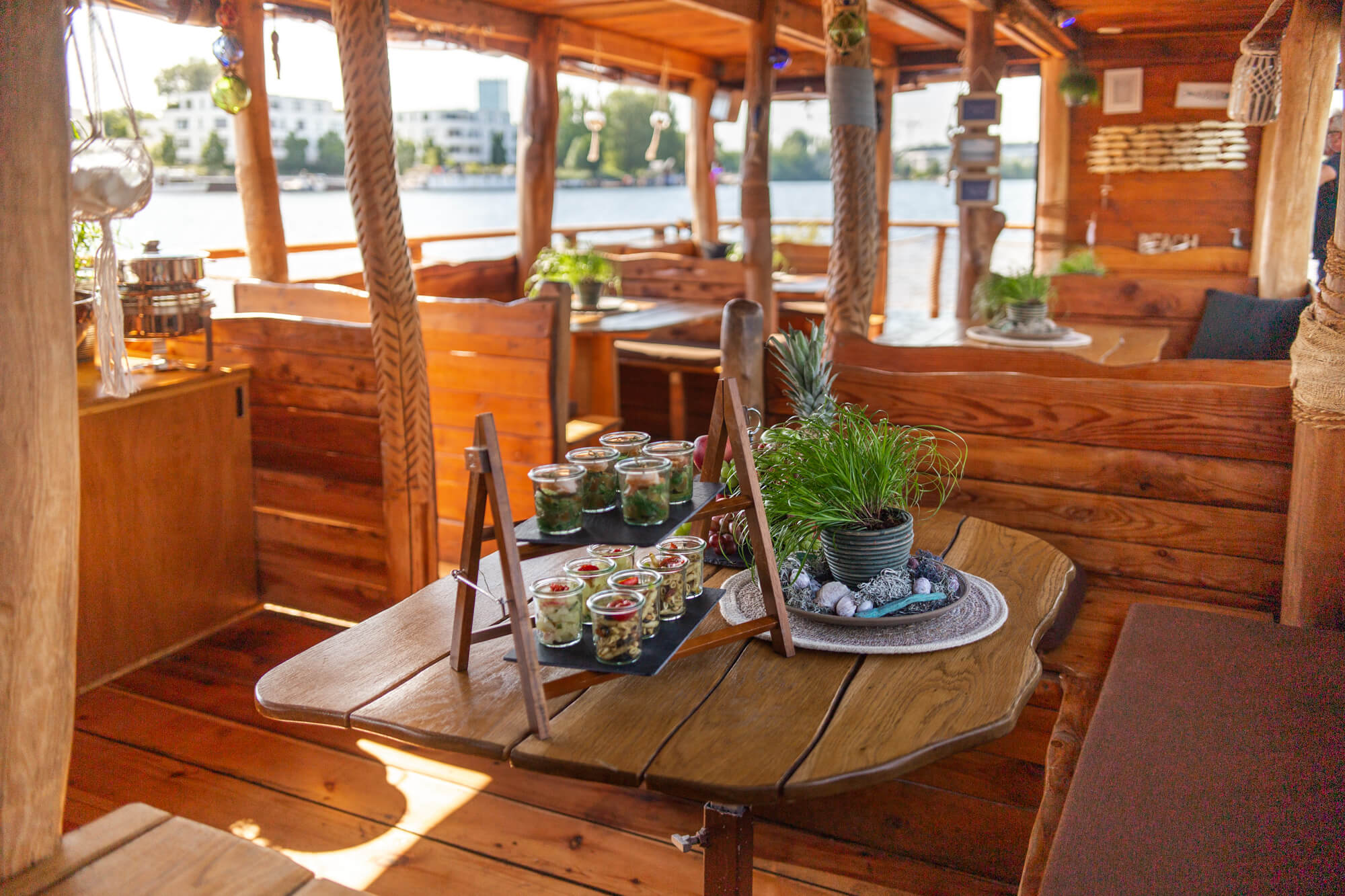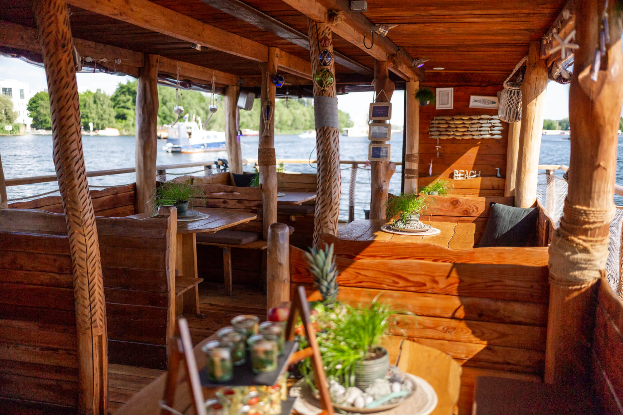 Das Hauptstadtfloß I ist komplett aus Holz gebaut und verzaubert durch seine offene Bauweise und den rustikalen Charme. Unter Deck verfügt das Floß über sechs große Sitzecken, die zum gemütlichen Zusammensitzen und Speisen einladen.