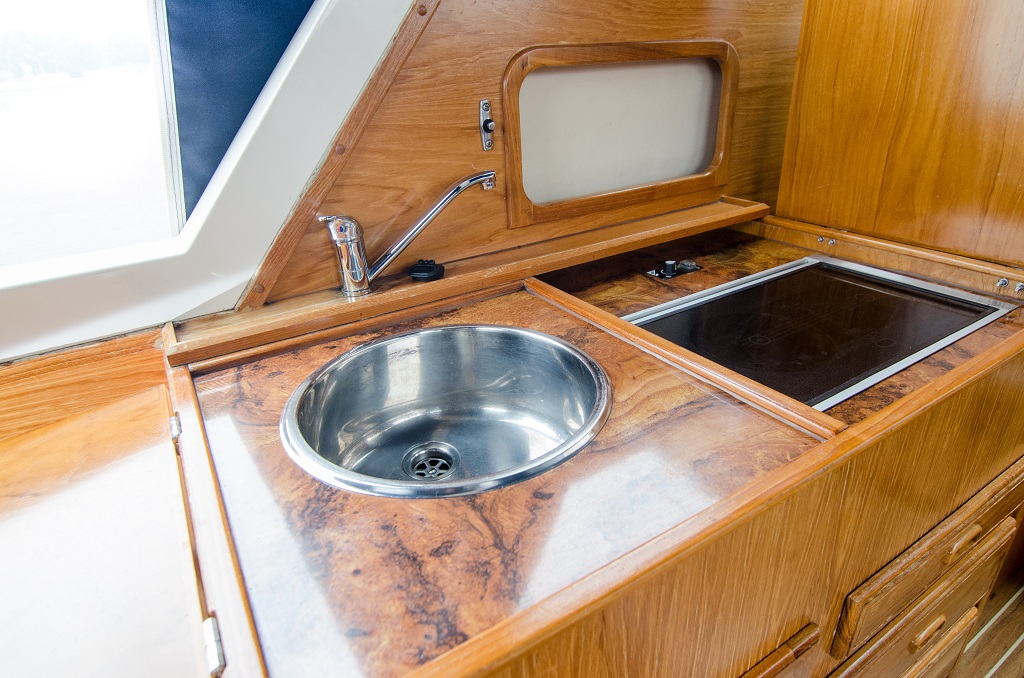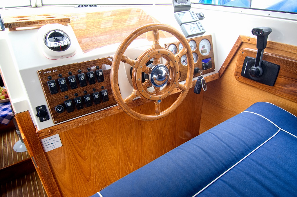 Diese Yacht ist in typischer Klinkerbauweise gebaut und durch den durchgängigen Kiel mit feststehender Welle und Ruderblatt sowie der Bugschraube sehr gut zu manövrieren.