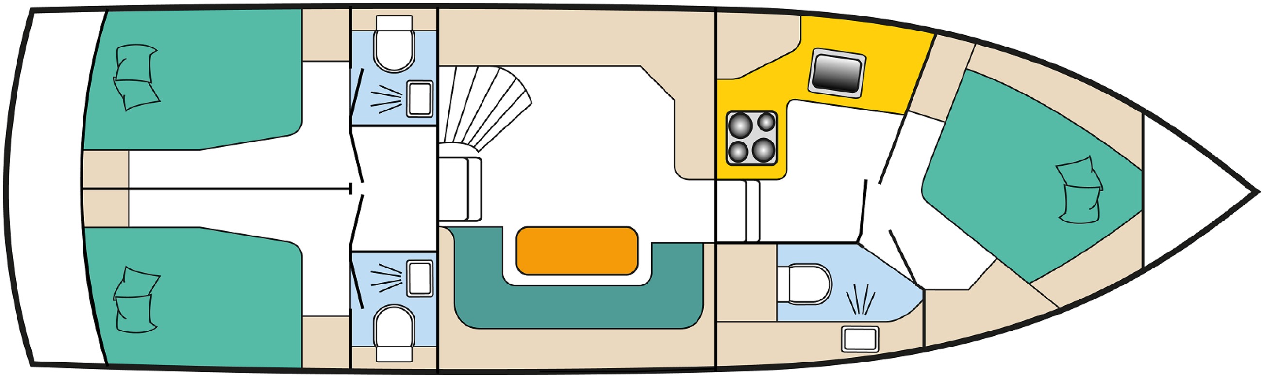 Die Siva ist eine "Aqua Yacht 1200" und ideal für drei Paare und größere Gruppen geeignet. Sie besitzt drei Doppelbettkabinen (keine Etagenbetten). Das großzügige Oberdeck bietet ausreichend Platz und lädt zum Verweilen ein. Aufgrund des Bug- und Heckstrahlruders gelingt jedes Anlegemanöver.